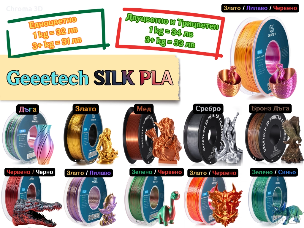 •Geeetech — PLA SILK — Gold (златист) — 32 лв / 31 лв (1 кг / 3+ кг)