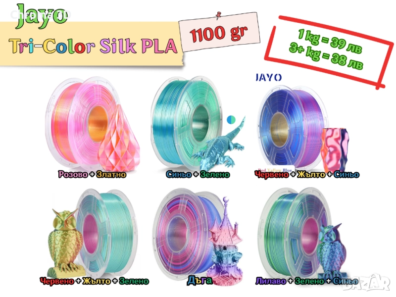 •Jayo — PLA SILK+ Tri-Color — Red+Yellow+Blue 1.1KG (червено+жълто+синьо) — 39 лв / 38 лв (1.1 кг / 3+ кг)