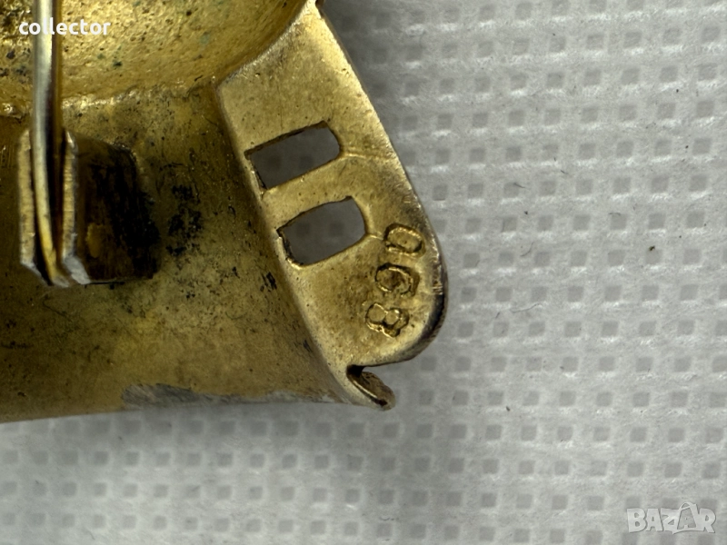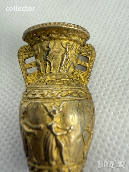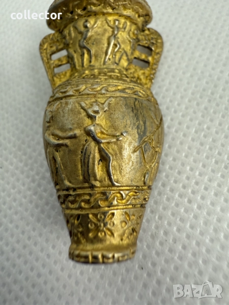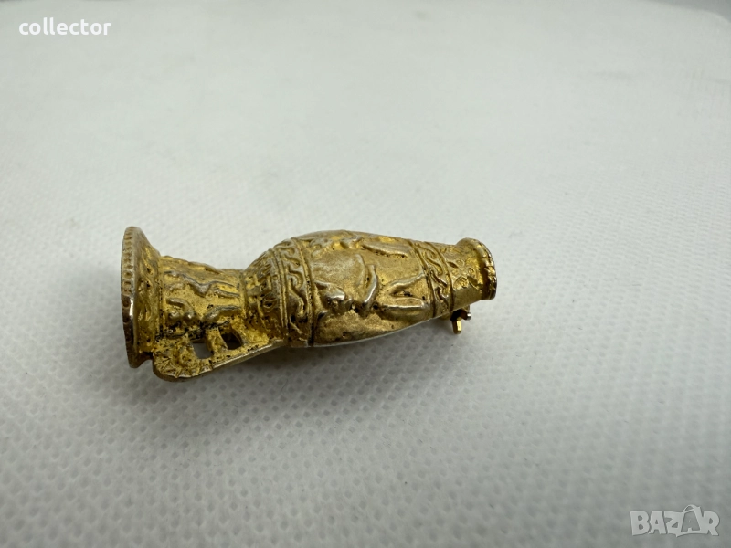 Сребърна брошка с позлата, отлично състояние. Брошката е украсена с релефни фигури на божества от египетската митология. Детайлни орнаменти по дръжките и основата на брошката.