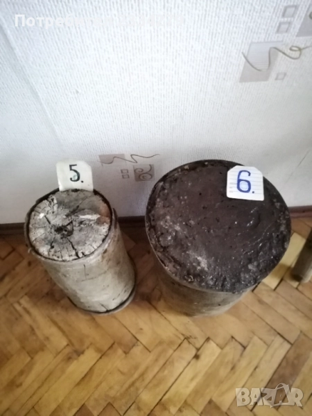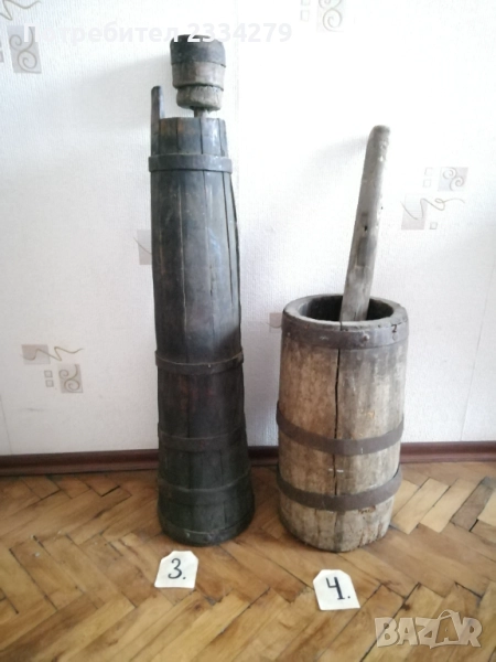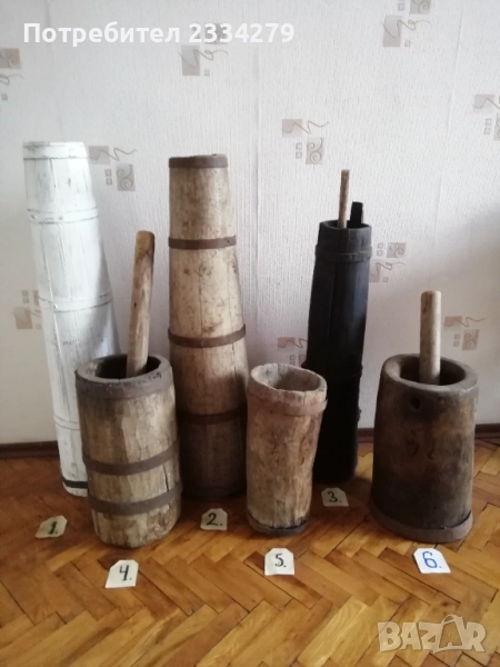 Стари дървени домакински съдове от бита преди 100години. N:1 стара ръчно изработена бутала за масло с размери 1м. Х23см., цена 35€.; N:2 бутала за масло ръчно изработена от бъчвар с размери 33х27см., цена 40€.; N:3 бутала за масло с размери 80х21см., цена 35€.; N:4 старо ръчно дълбана чукало за продукти с размери 45х23см., цена 20€.; N:5 старо чукало, чутура с размери 42х17см., цена 17€.; N:6 чутура за подправки, билки червен пепер с размери 44х27см, цена 15€. Всичко е 100% автентичност.