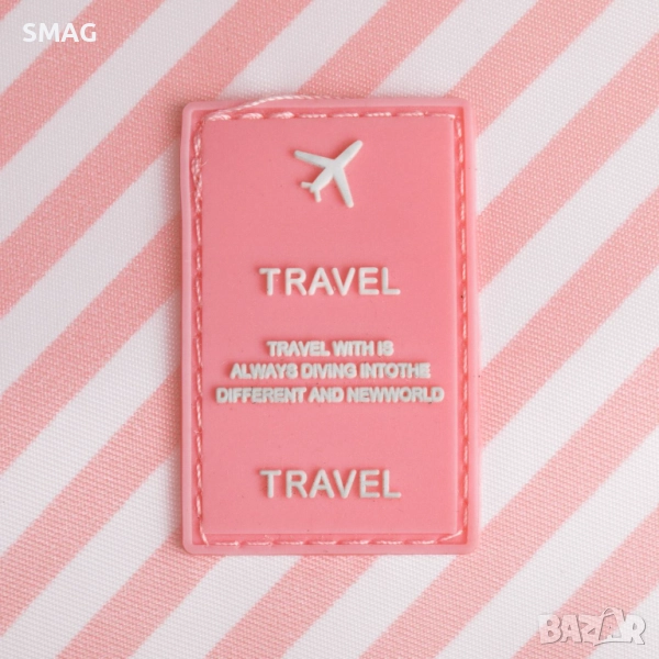 Стилен несесер тип куфарче в розово-бял раиран десен, идеален за пътувания и организирано съхранение на принадлежности. Разполага с две отделения и вътрешни джобчета за кабели, бижута или дребни аксесоари. Удобната дръжка осигурява лесно пренасяне и комфорт при път.