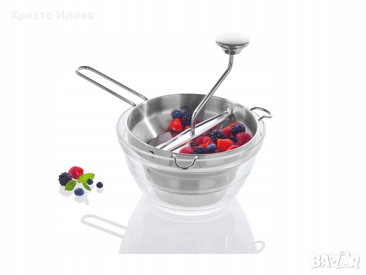 Мелничката / уредът за пасиране не само прави пюрета, но и отделя костилки и обелки от пюрето, тя е перфектно подходяща за производството на мармалади, сладка и компоти.