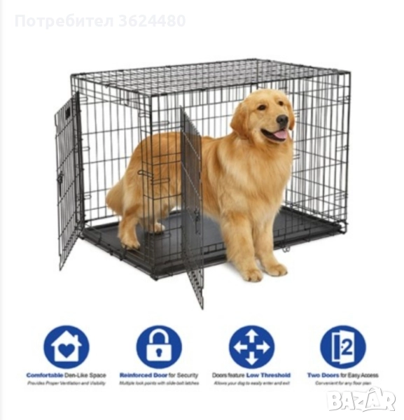 клетка с две врати. Размери 107х71х77 см Осигурите простор комфорт и безопасност на вашия голям любимец. Проектирана да издържи на по голямо натоварване, тя разполага със здрава метална решетка с дебелина 4мм и тегло 9.1 кг. Две врати предна и странична. Лесно сгъване и разгъване я прави изключително практична за сърнанение и пренасяне. Идеална както за безопасен транспорт така и за създаване на уютно пространство вкъщи.