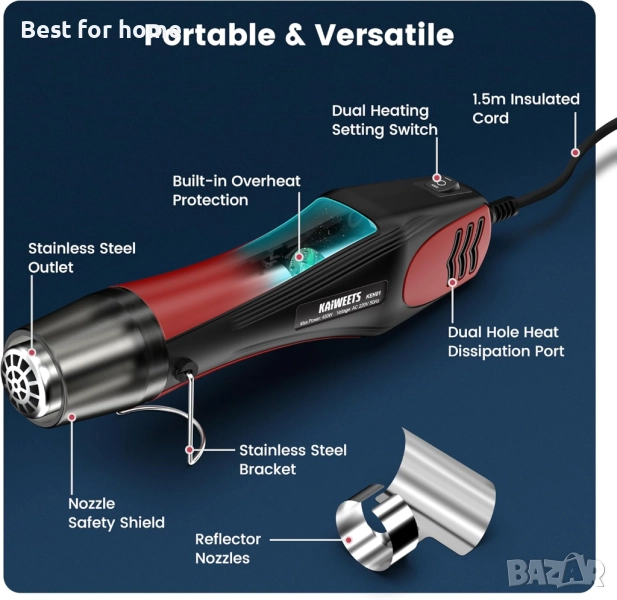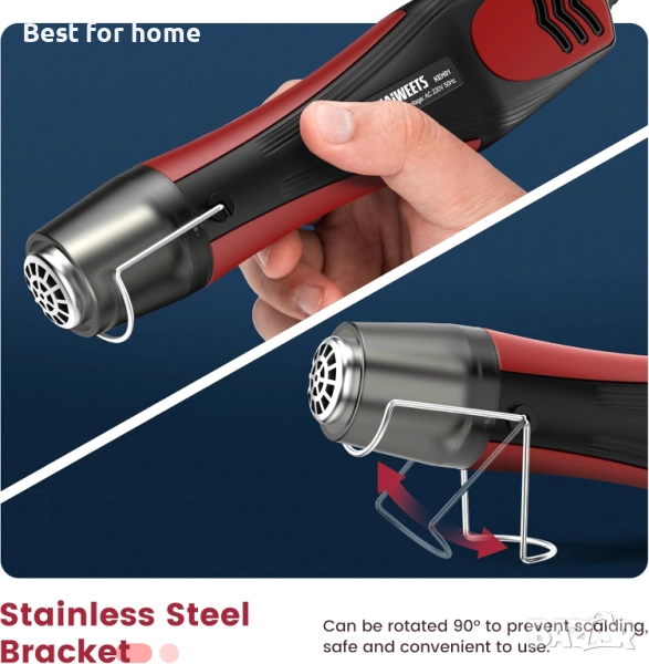 【Практични аксесоари】Пистол за горещ въздух KEH01 с вградена метална стойка за стабилно стоене, по-безопасна работа без ръце и централизирана дюза за точно насочване на топлинния поток към повърхността за подобрена ефективност.