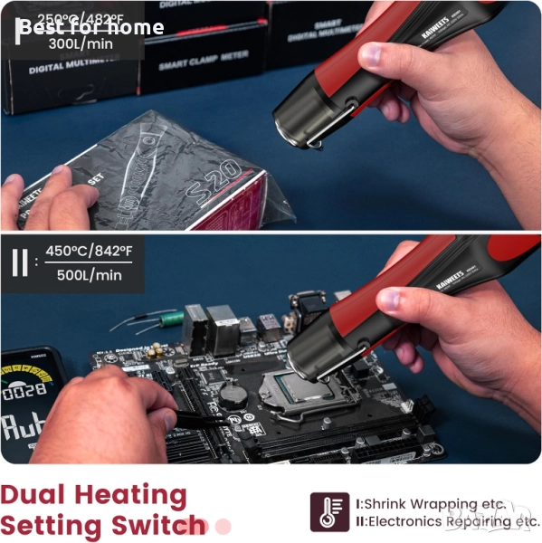 【450W, Бързо нагряване】KAIWEETS KEH01 е мини пистолет за горещ въздух с 2 регулируеми степени на нагряване, 450W и бързо покачване на температурата. С по-голяма мощност от обикновения мини пистолет за горещ въздух, той може да се нагрее бързо след включване и да поддържа температурата и въздушния поток, за да подобри ефективността на работа.