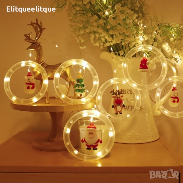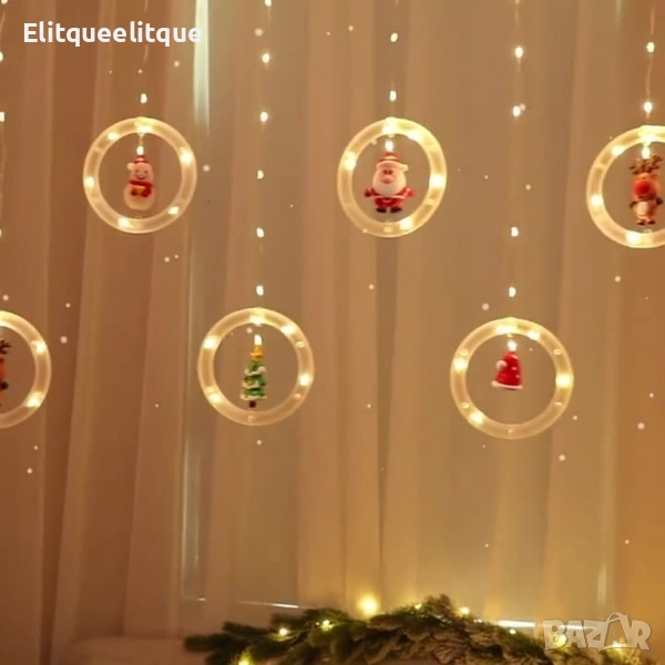 Светещи LED рингове с коледни фигурки, тип завеса 3м, 10 ринга на батерии.