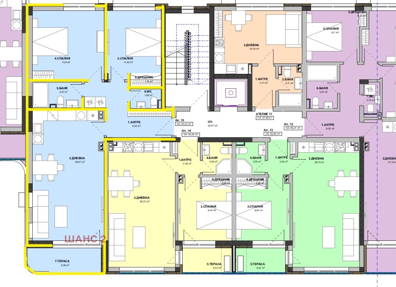 Ап. 15 е разположен във вх.А, на 4-ти етаж (не е последен) с хубава морска гледка. Застроената му площ е 95 кв.м, обща площ (с общи части) 106 кв.м. Разпределението е: просторна всекидневна с кухненска част 30 кв.м с излаз на тераса 6 кв.м, спалня 16 кв.м, втора спалня 12 кв.м, баня с тоалет, тоалет и входно антре.