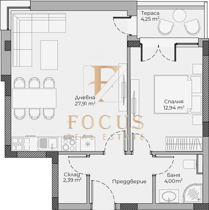 Апартаментът е с обща площ от 74,14 кв.м. със следното разпределение: антре, хол с кухненски бокс, спалня, баня с тоалетна, склад и тераса.