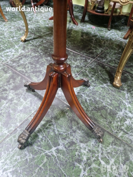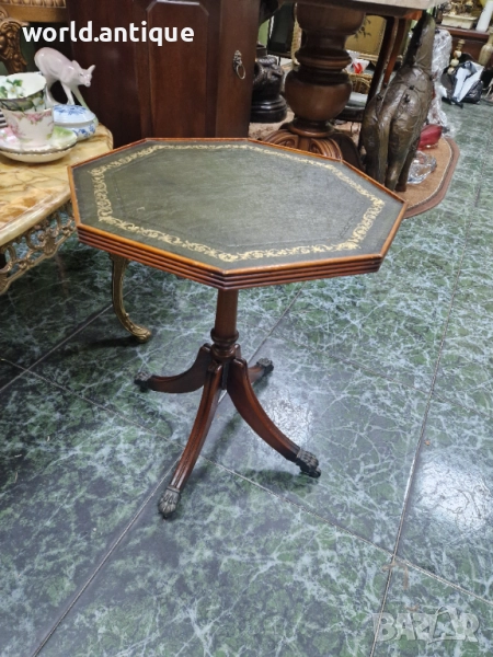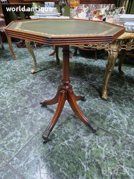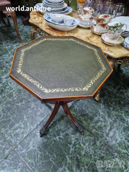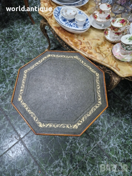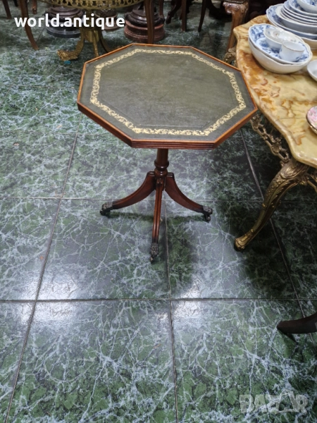 Продавам уникална маркова изключително красива антикварна английска дървена масичка с кожен плот на колелца в перфектно състояние без никакви забележки с наличните маркировки. Размери височина 52 см плот 42 см. Чудесно допълнение към интериора на Вашия дом офис вила ресторант хотел. Подходяща и за подарък. Работя с всички куриери. Отговарям бързо.