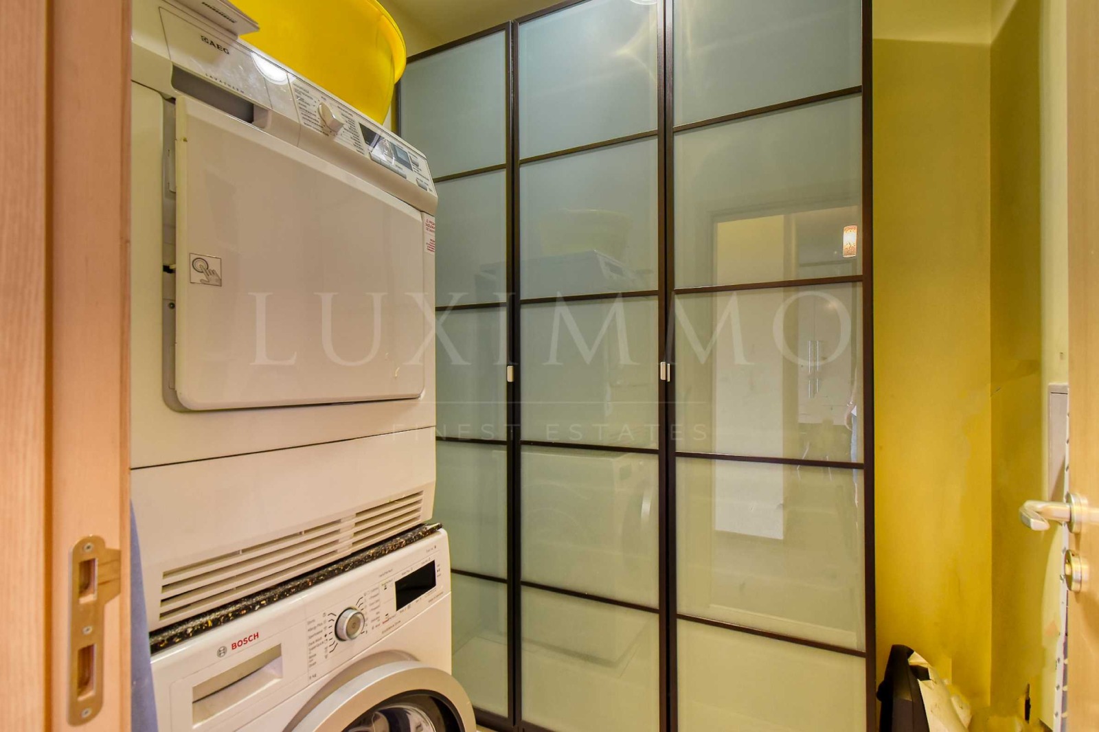 Апартаментът се състои от входно антре, просторна дневна зона с кухненски бокс, оборудван с висок клас електроуреди, трапезария с елегантна маса и столове, както и комфортен кът за отдих с мека мебел и телевизор. В отделно помещение е обособен дрешник с пералня и сушилня, осигуряващ практично решение за ежедневието. Спалните помещения са две родителска спалня с уютна атмосфера и втора стая, която може да се използва като детска или работен кабинет, оборудвана с удобно бюро.