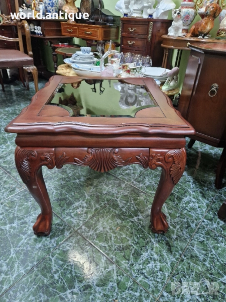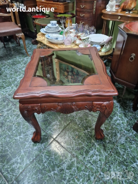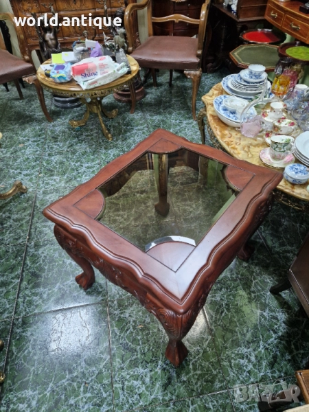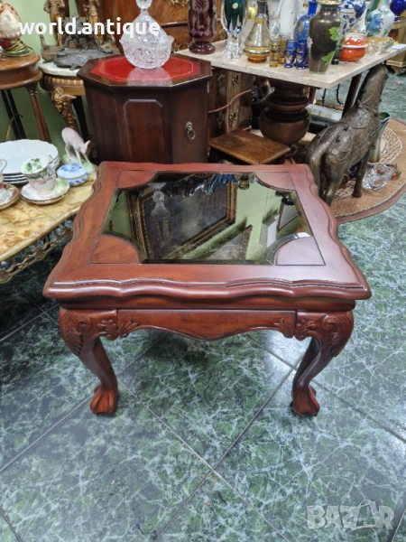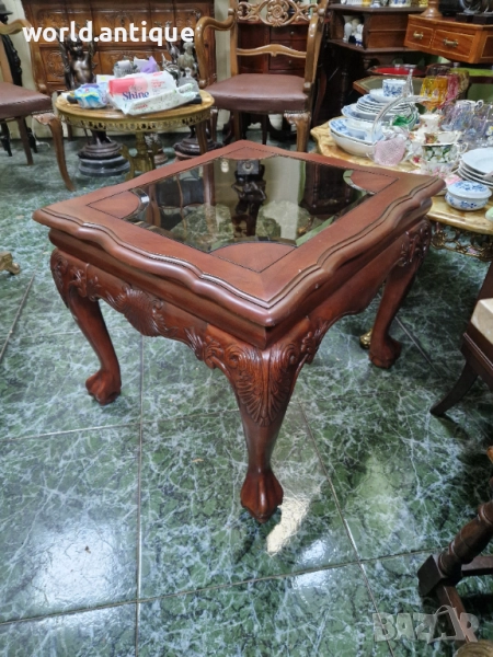 Продавам уникална изключително красива антикварна английска дървена маса Чипъндейл в перфектно състояние без никакви забележки с плотот фацетираностъкло.. Тежка здрава масивна. Размери 68 см дължина 58 см ширина и височина 55 см. Работя с всички куриери. Отговарям бързо.