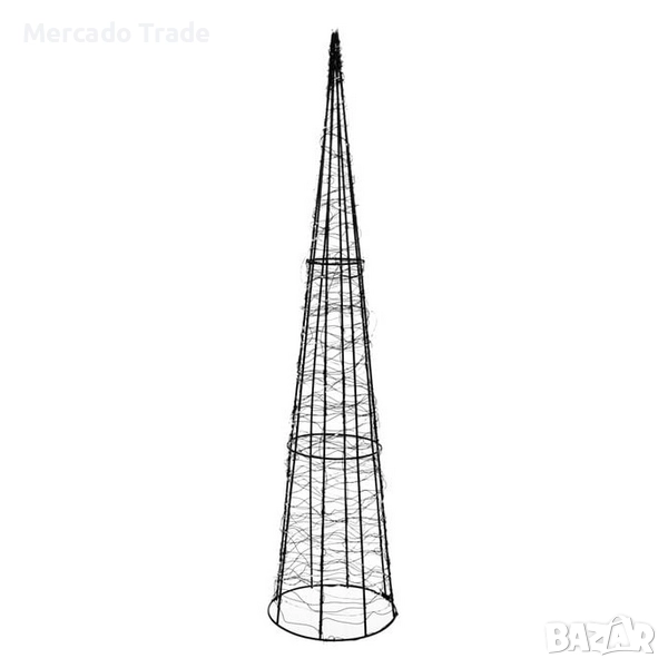 Декоративна коледна елха с черна метална рамка, осветена с шишарка. Разполага с 300 сплетени LED крушки с топла бяла светлина и 8 функции.