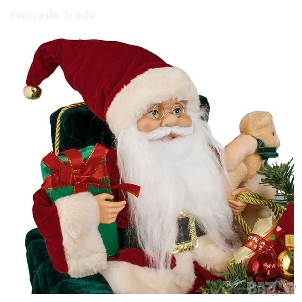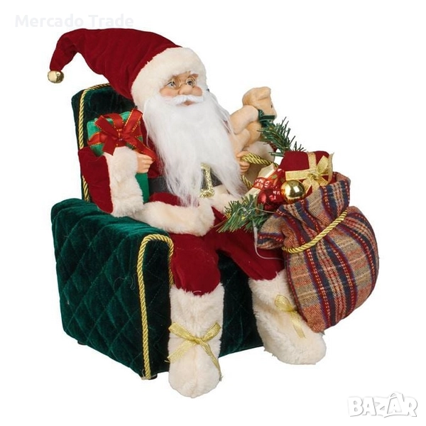 Коледна декоративна фигурка Дядо Коледа, седнал в зелен кадифен фотьойл, държейки подаръци и плюшено мече, докато в краката му е чувалът му, пълен с подаръци.