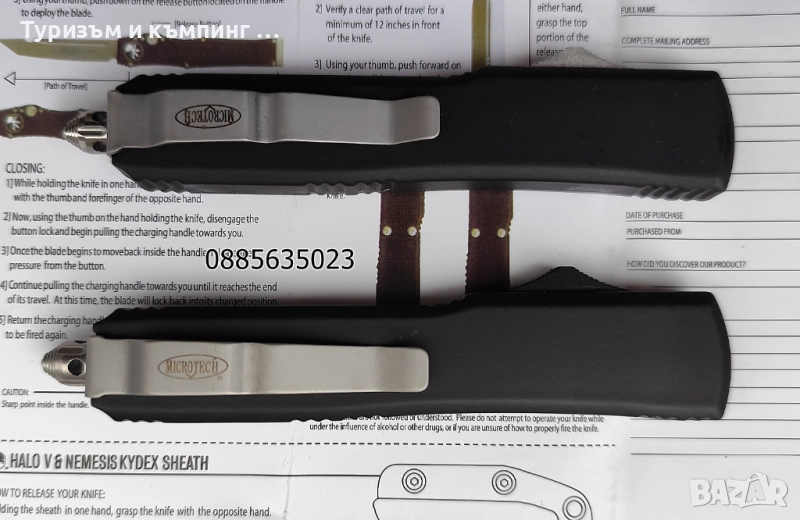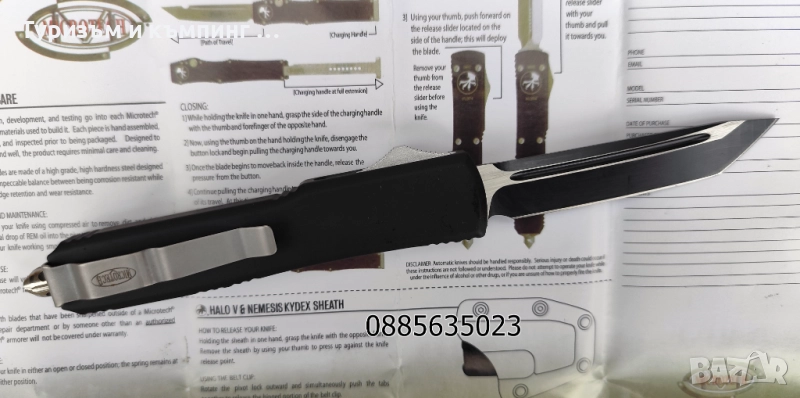 Дръжката е изработена от анодизиран алуминий, острието е изработено от стомана D2