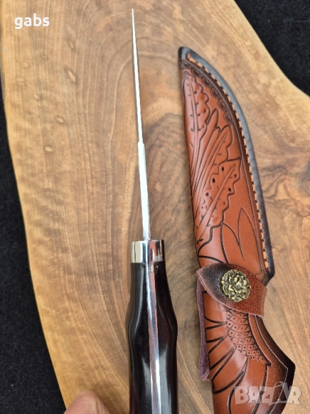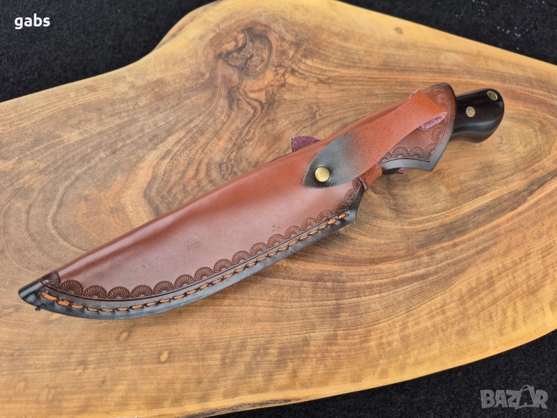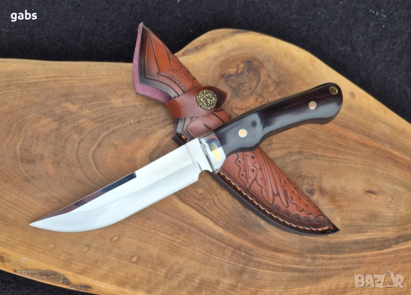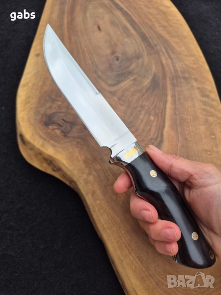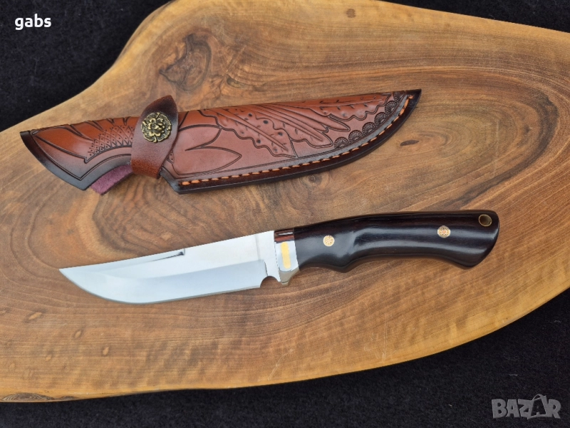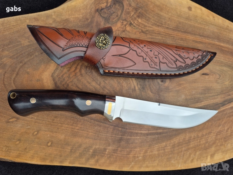 нож, изработен от неръждаема стомана 440C с твърдост 58HRC, с дръжка от полирано тъмнокафяво дърво, закрепена с месингови нитове, придружен от кожена кания.Изящен ръчно изработен нож, създаден с внимание към всеки детайл. Острието е изработено от висококачествена стомана 440C, гарантираща отлична острота и издръжливост при твърдост 58HRC. Дръжката, изпълнена от полирано тъмно дърво и фиксирана с елегантни месингови нитове, осигурява комфортен и сигурен захват. Този нож се предлага в комплект с прецизно изработена кожена кания, която го предпазва и допълва неговата класическа визия. Това е перфектното съчетание от функционалност, естетика и майсторска изработка.
