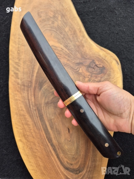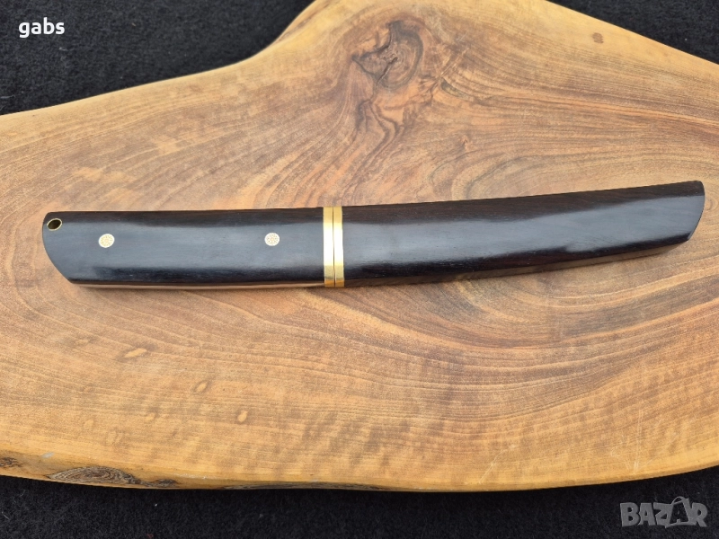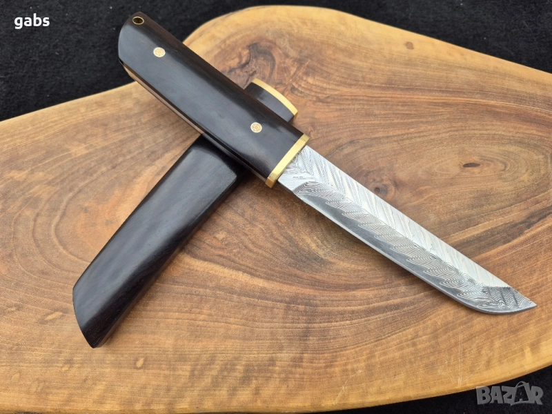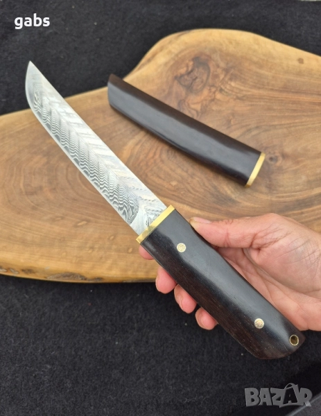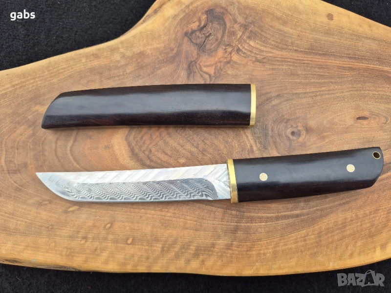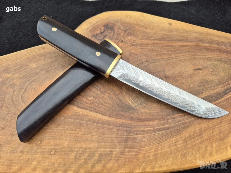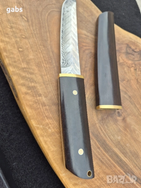 нож е пример за изключителна изработка и висококачествени материали. Острието от дамаска стомана Damaskus VG10 Suminagashi, в японски стил, гарантира изключителна острота и издръжливост. Дръжката от полирано абаносово дърво осигурява комфорт и сигурен захват при употреба. Комплектът включва и елегантна кания от същото дърво, предпазваща острието. Предлага се в луксозна подаръчна кутия, което го прави идеален избор за ценители и колекционери.