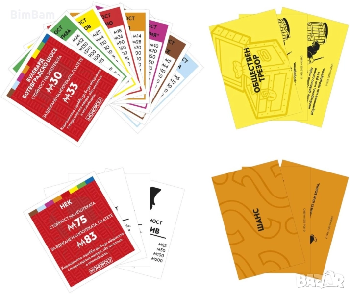 Съдържа: игрална дъска, 8 жетона, 28 нотариални акта, 16 карти „Шанс“, 16 карти „Общинска каса“, 32 къщи, 12 хотела, 2 зара, поднос за съхранение, комплект с пари и наръчник за игра.