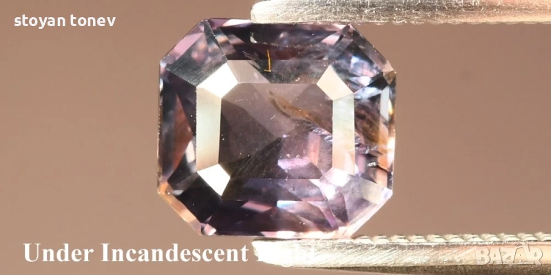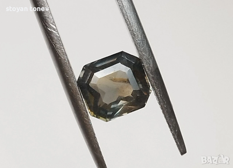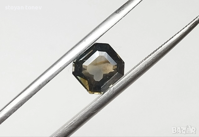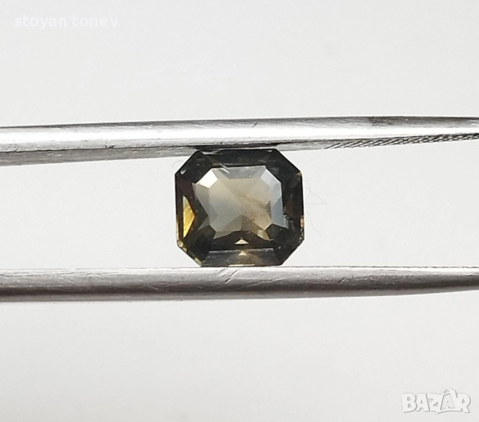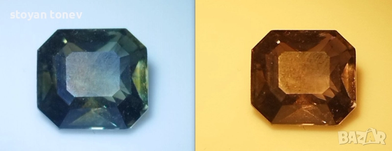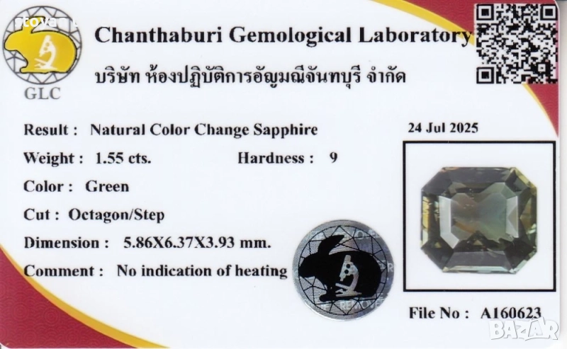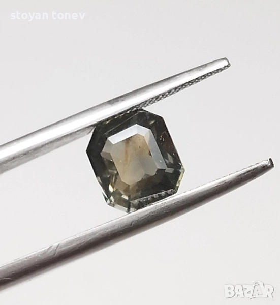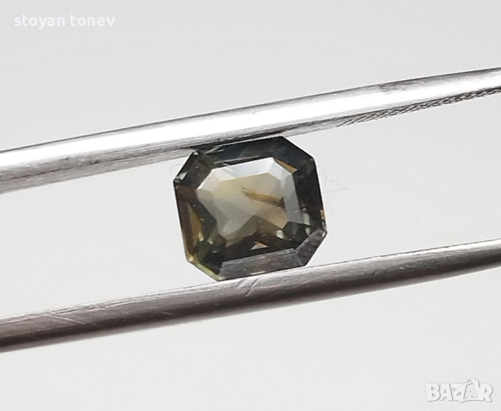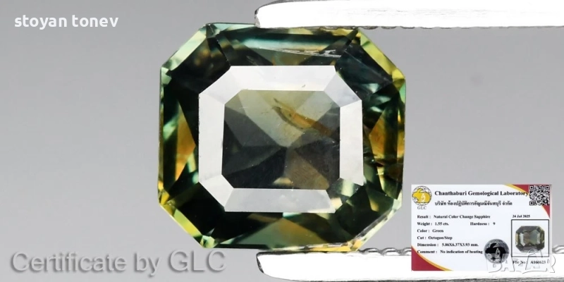 Естествен сапфир с тегло 1.55кт. и произход Танзания. Чистота SI1 с минимални видими включения. Цвета е зелен, като при жълто осветление се променя в лилав. Форма октагон с размери: 6.37 x 5.86 x 3.93 mm.