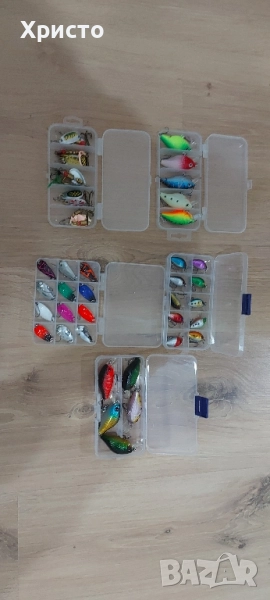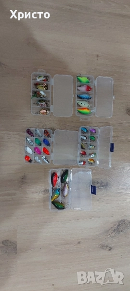 Нови комплекти с кутии за спининг риболов, цена за кутия по ваш избор 6евро. Подходящи за риболов на щука кефал костур пъстърва и други. За поръчка ни пишете име тел и адрес на куриера еконт и желания МОДЕЛ.