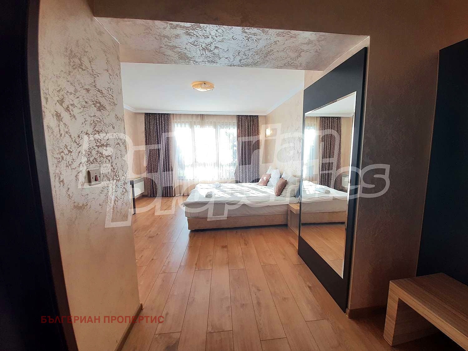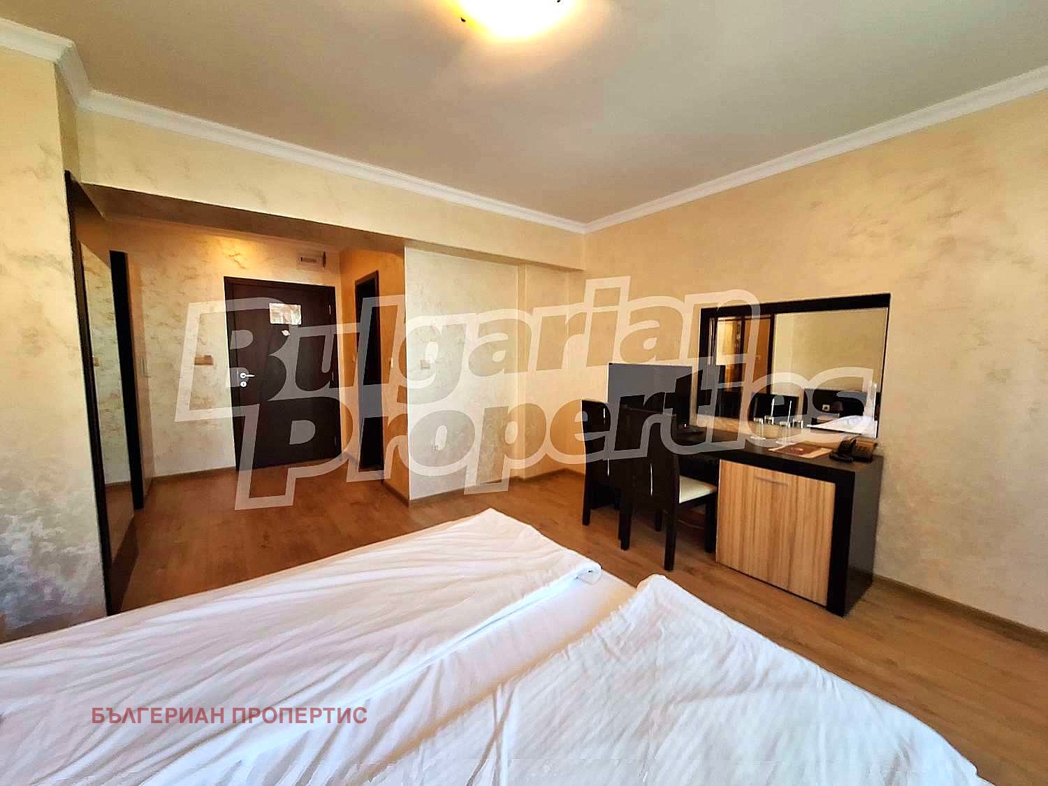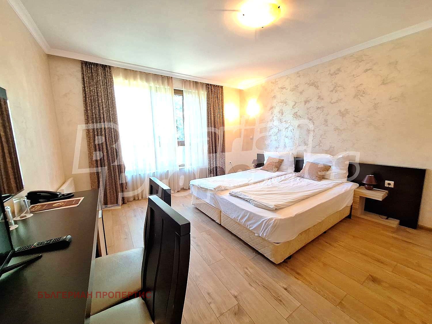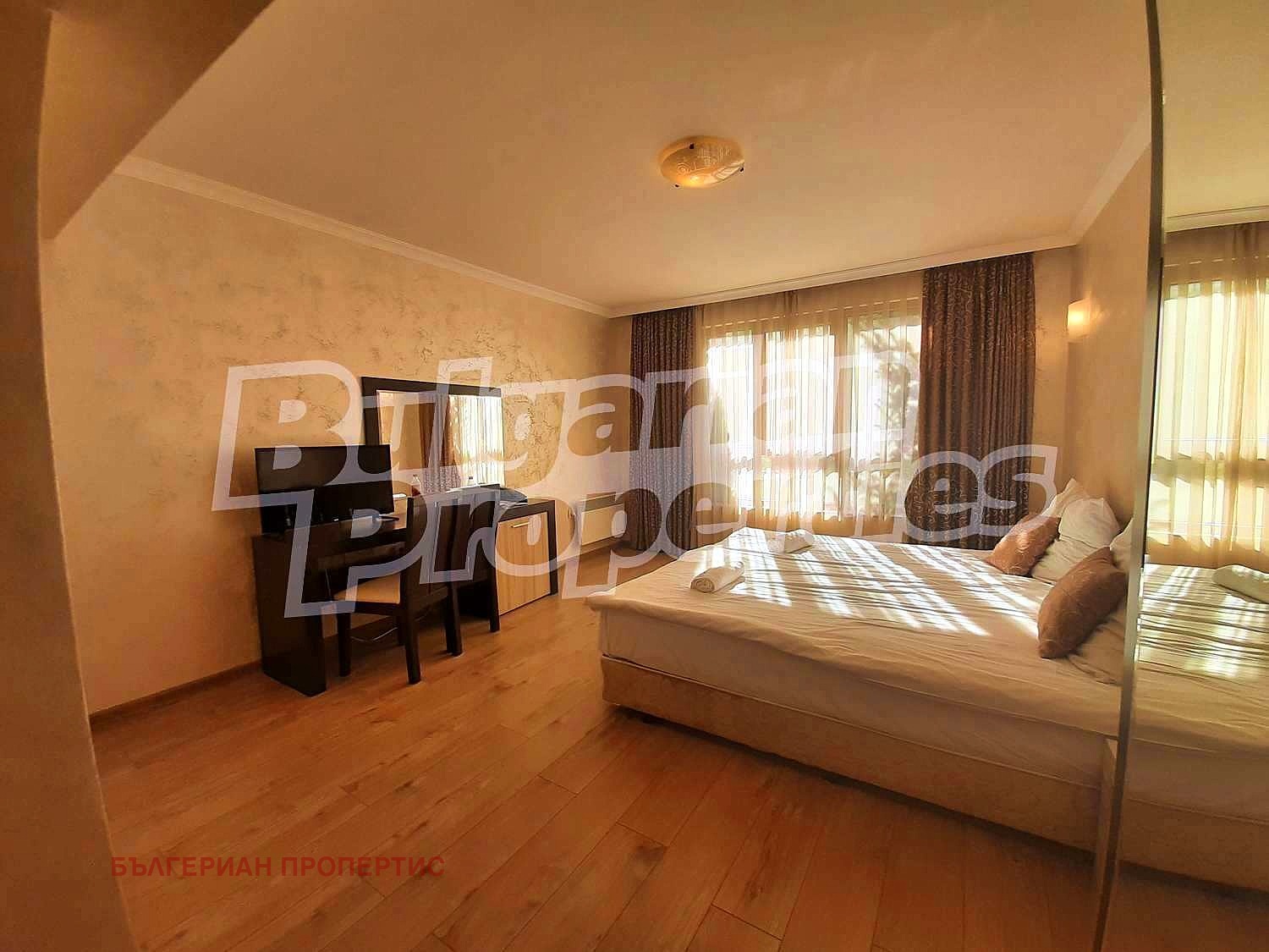 Дневна със спален кът - голяма спалня, две нощни шкафчета, гардероб, бюро с два стола, малък хладилник;