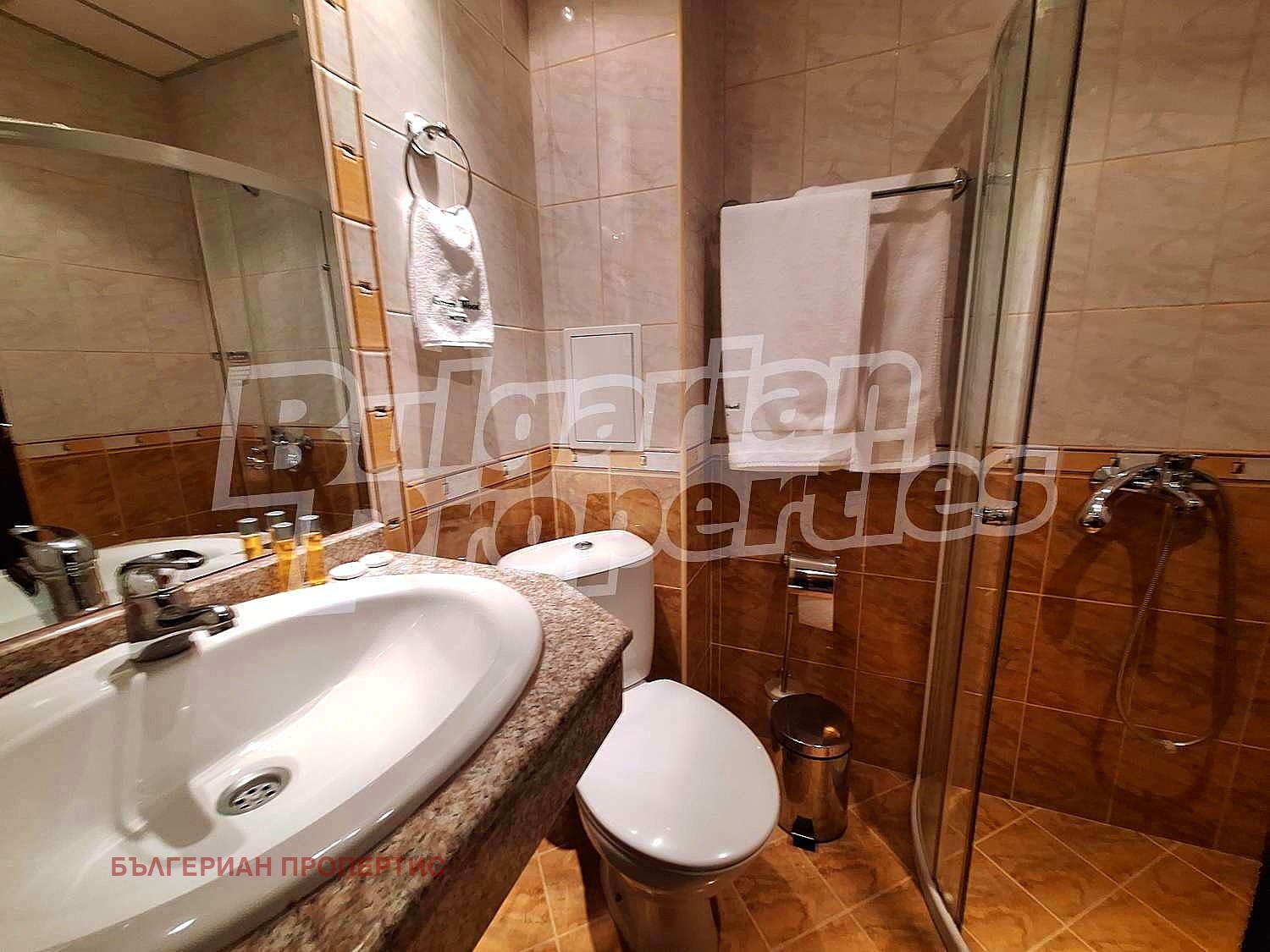 Баня с душ кабина, тоалетна, мивка и бойлер.
