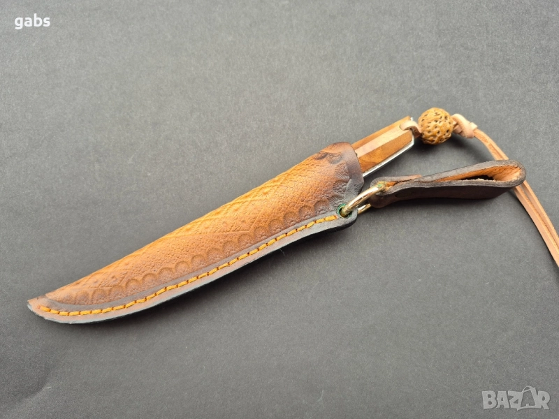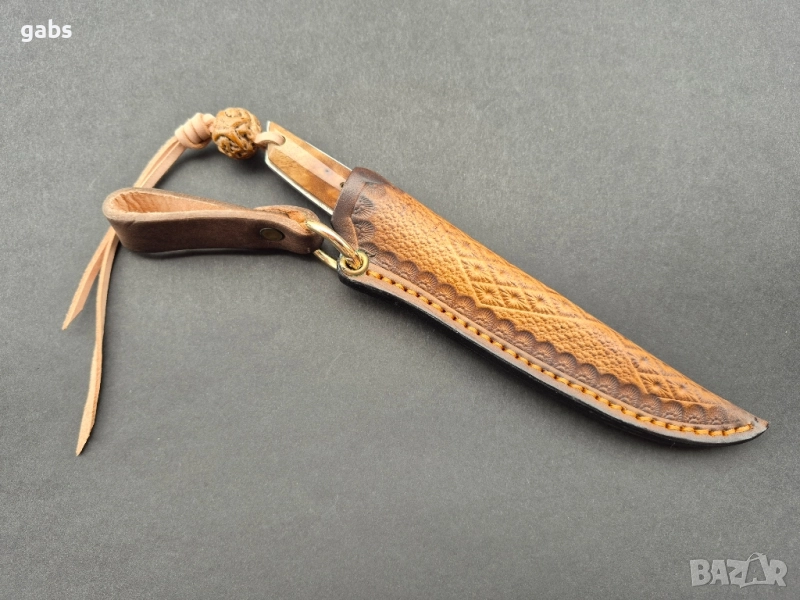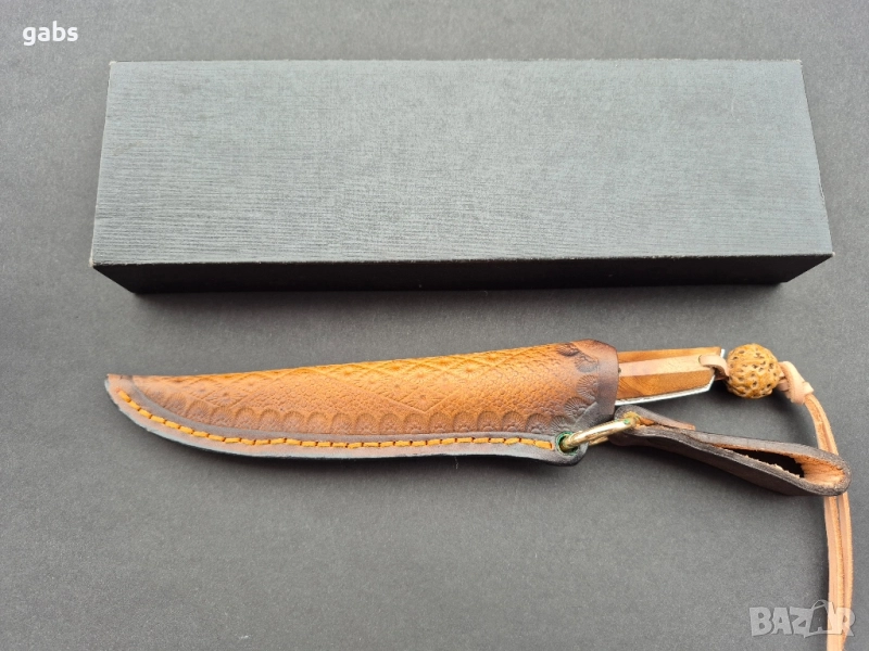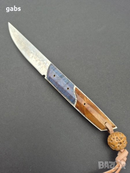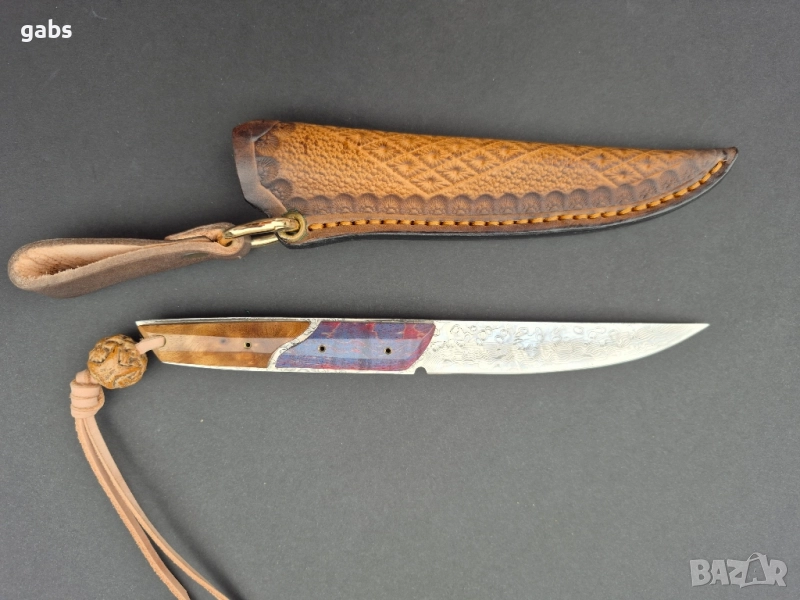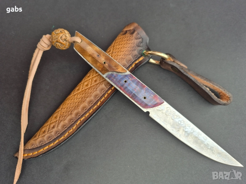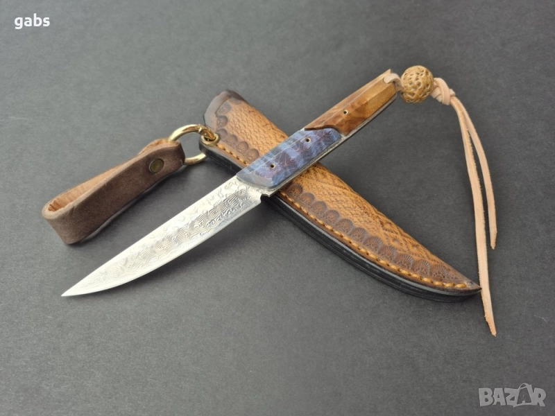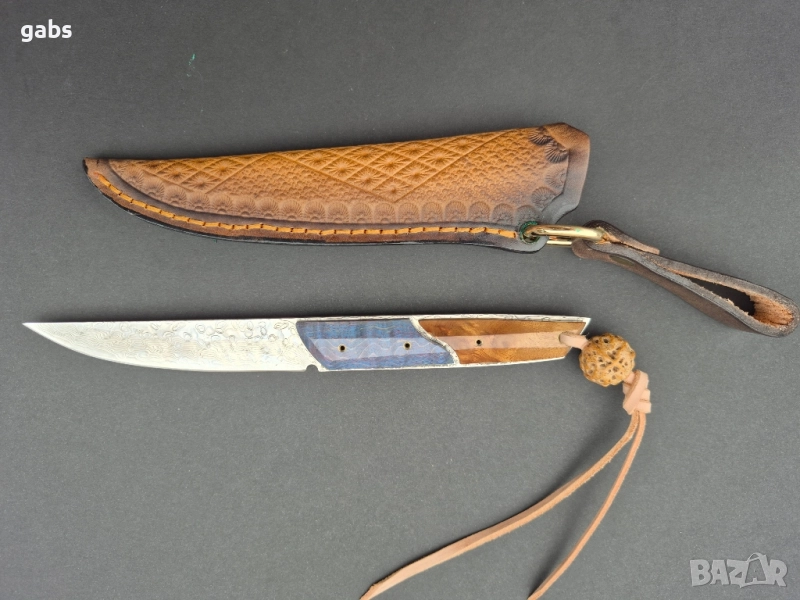 нож, изработен от висококачествена дамаска стомана. Острието притежава изключителна здравина и запазва режещите си свойства дълго време. Дръжката е ергономична, изработена от двуцветна стабилизирана дървесина, която осигурява сигурен и комфортен захват. Този модел се отличава с елегантен дизайн и прецизна изработка. Към ножа е приложена и здрава кожена кания за безопасно съхранение и носене.