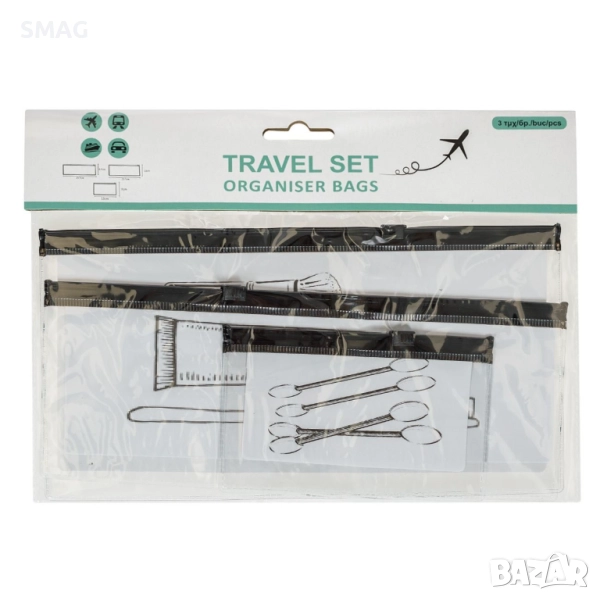 Комплект от три прозрачни несесера с черни детайли, идеални за пътуване и организиране на тоалетни принадлежности. Подходящи за грим, паста и четка за зъби, памучни тампони и други дребни вещи. Прозрачният дизайн позволява лесно откриване на съдържанието.