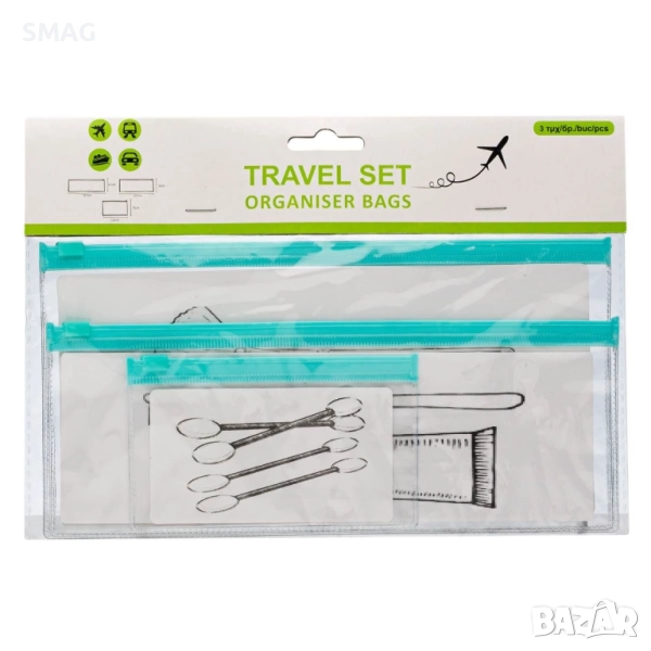 Практичен комплект от три прозрачни несесера с тюркоазени детайли, идеален за пътуване и съхранение на тоалетни принадлежности, грим или аксесоари. Компактните размери позволяват лесно подреждане в багаж и бърз достъп до съдържанието. Устойчиви и лесни за почистване.