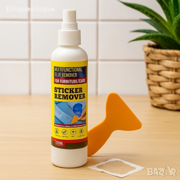 Обем: 120мл; Предназначение: Премахване на стикери, лепила и остатъци от лепкави вещества; Допълнителен инструмент: Ергономичен инструмент за стъргане; Подходящ за: Мебели, коли и други повърхности; Вид на опаковката: Специфичен спрей за лесно нанасяне.