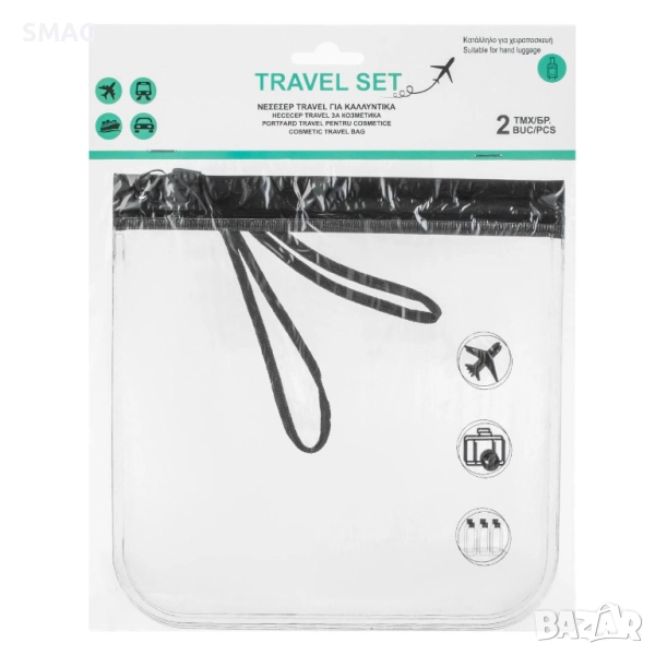 Комплект от 2 прозрачни несесера за пътуване, идеални за козметика, тоалетни принадлежности и аксесоари. Здравата пластмаса и удобната черна дръжка осигуряват комфорт и лесен достъп, а прозрачният дизайн позволява бързо откриване на съдържанието. Подходящи са за ръчен багаж и ежедневна употреба.