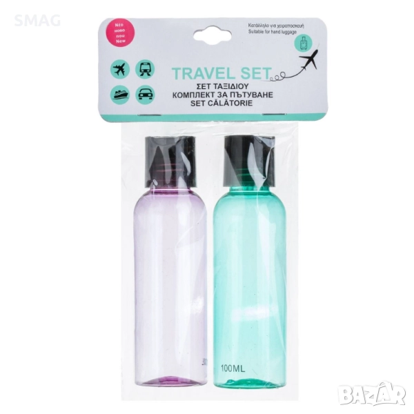 Комплект от две бутилки за пътуване в свежи цветове — зелено и лилаво, с черни винтови капачки. Идеални за шампоан, душ гел или лосион, като същевременно спестяват място в багажа. Подходящи за носене в ръчен багаж и ежедневна употреба.