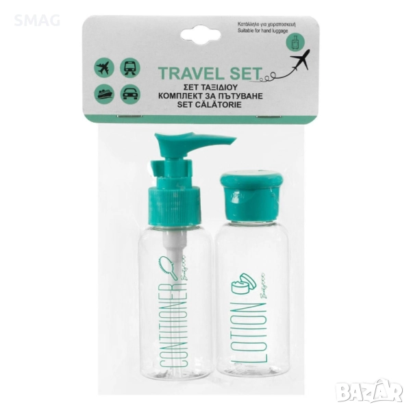 Стилен комплект от две прозрачни бутилки за пътуване с капачки в цвят вераман (синьо-зелен). Подходящи за лосион, балсам или други козметични продукти. Компактни, практични и лесни за употреба, идеални за пътуване и ръчен багаж.