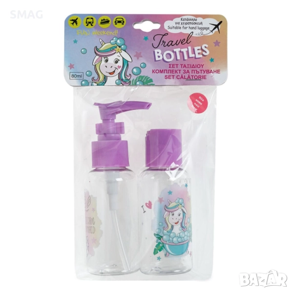Очарователен комплект от две прозрачни бутилки за пътуване с дизайн тип еднорог и лилави капачки. Подходящи за шампоан, балсам или лосион, те са практични за ръчен багаж и лесни за употреба. Компактни и забавни, те правят пътуването по-организирано и стилно.