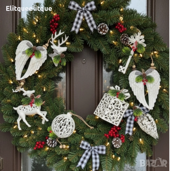 Тип: Висящи орнаменти за елха, венец и празнична украса Стил: Скандинавски, елегантен, бял релеф с натурален канап Закрепване: Въже от естествен канап за лесно поставяне Предназначение: За елха, венец, гирлянд, камина, маса или витрина Използване: Само за вътрешна декорация Кутия-подарък – орнамент с изящен ажурен дизайн и декоративна панделка. Елен – фигура с изваяни линии и натурален коледен акцент. Ключ – символ на домашното щастие и новото начало. Кръгла топка – отворен филигранен модел, улавящ отблясъците на лампичките. Шишарка – издължен орнамент с релеф, напомнящ заснежени клонки. Ангелски крила – детайлна фигура с перлен блясък и мек завършек. Еленска глава с рога – стилна декорация, символизираща зимната сила и енергия.