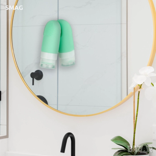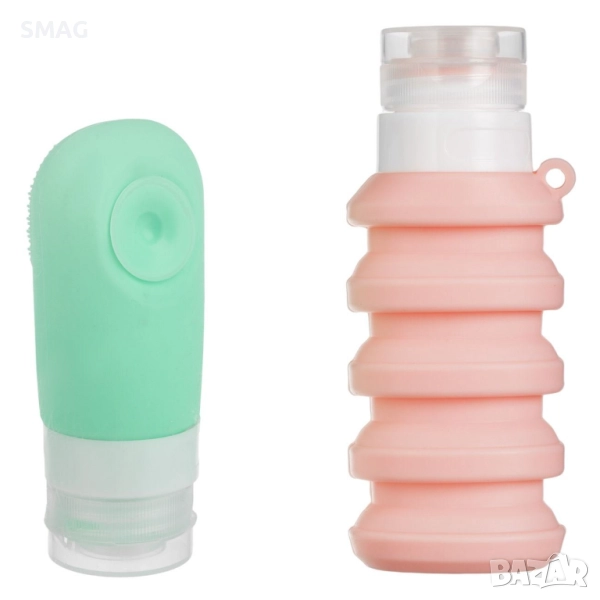 Комплект от две силиконови бутилки за пътуване в розово (60 мл) и светлозелено (100 мл) с винтови прозрачни капачки. Идеални за шампоан, балсам, лосион или други течни козметични продукти, те са компактни и практични за ръчен багаж. Прозрачната пластмасова опаковка осигурява лесно съхранение и организация.
