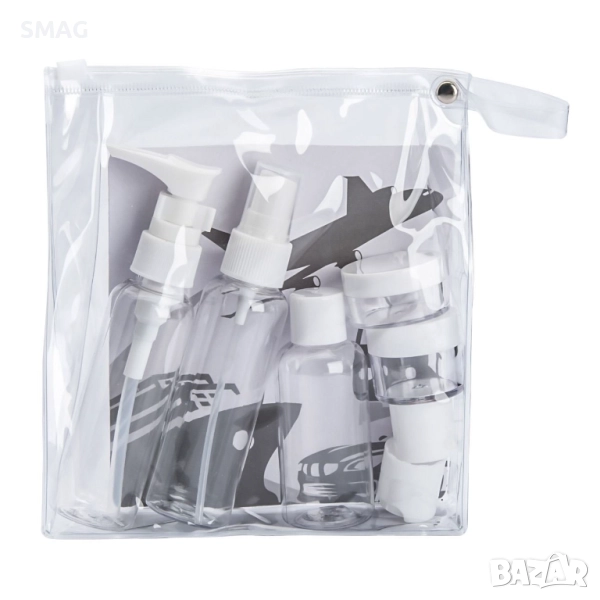 Практичен комплект от седем прозрачни бутилки и бурканчета за пътуване, включително 11 мл и 15 мл бурканчета, две бутилки по 60 мл и една 50 мл, с две резервни помпи. Подходящи за шампоан, балсам, душ гел и кремове, те спестяват място и улесняват организацията на несесера. Всички елементи са събрани в компактна прозрачна чанта с пластмасово затваряне.
