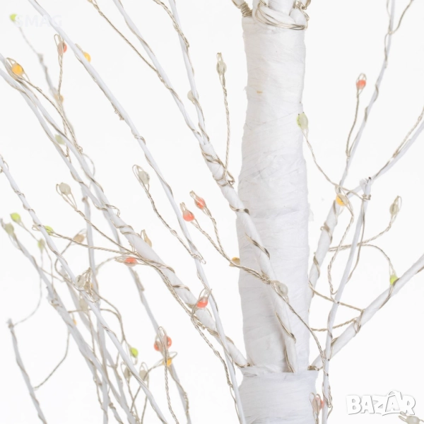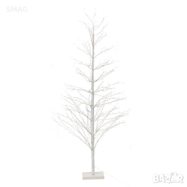 Коледна елха в бял цвят с тънки клонки, украсени с 767 многоцветни LED светлини (3,2 V, 20 mA). Елхата има стабилна дървена основа и лесен монтаж, подходяща за вътрешни пространства. Идеална за празнична декорация, създава празнична атмосфера у дома или в офиса.