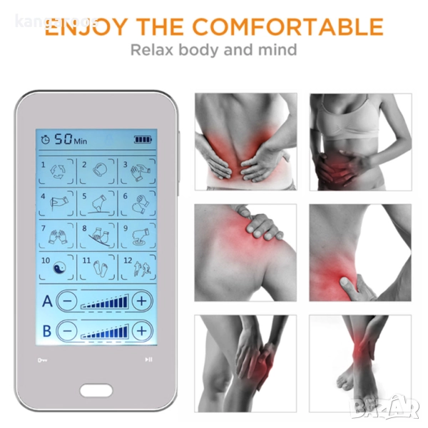 ❇2 КАНАЛА И 4 ЕЛЕКТРОДА: Проектирани с канал "A" и "B", 12 режима и 20 нива на сила, можете да се насладите на 2 различни режима и сила с 2 електрода. Например, можете да изберете режим на акупунктура в канал A с ниво на интензивност 5 за рамото. Докато сте в канал B, режимът на потупване се изпълнява с интензивност, зададена на ниво 8, върху долната част на гърба като електрически стимулатор за гръб. Доставя се с 10 броя самозалепващи се проводими подложки за многократна употреба.