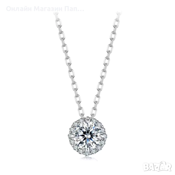 Колие от истинско 925 сребро с централен мойсанит D-цвят и чистота VVS1, шлифован с EX (Excellent) качество за максимален огън и сияние. Предлага се в два размера — 0.5 карата и 1.0 карат (цена 64,15 лв.), според предпочитания за фин или впечатляващ блясък.