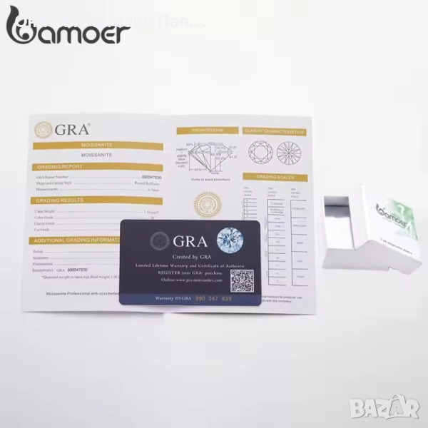 Включен е оригинален GDTC сертификат, който доказва автентичността и качеството на камъка — гаранция, че получавате истински мойсанит, а не цирконий.