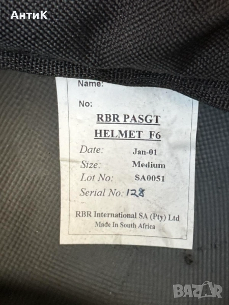 Балистична тактическа каска изработена от кевлар - RBR Pasgt F6 MK2. Отлично запазена, без захабяване и зацапване. Подходяща за колекция. Моделът се ползва в САЩ, страните от НАТО и др. В България моделът е ползван от Специалните подразделения на МВР СДВР СОБТ и др.