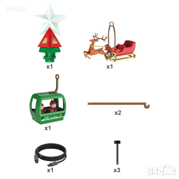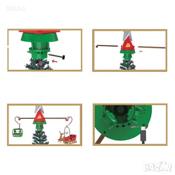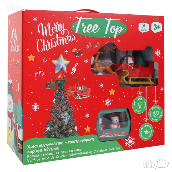Ефектен въртящ се връх за коледна елха с LED осветление и вградена музика, който създава истинска празнична магия. От едната страна има сцена с шейна, елени и Дядо Коледа, а от другата – уютна зимна стая със снежни човеци. Работи с USB кабел (включен в комплекта) и се монтира лесно с винтов механизъм.