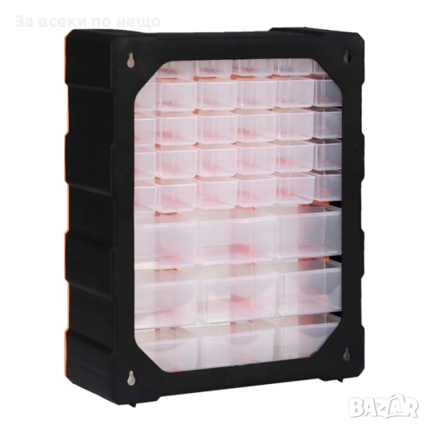 Комплектът включва 39 пластмасови кутии – 30 малки и 9 големи, които се закрепват към стенен панел. Това позволява удобна организация и добра видимост на всяка част, без излишно ровене.