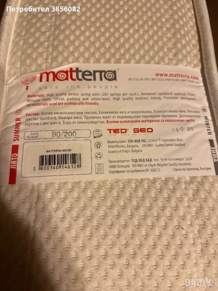 Матракът не е използван, въпреки че е закупен преди 3 години от лицензиран магазин на марката TED. Запазен е с оригиналната калъфка.