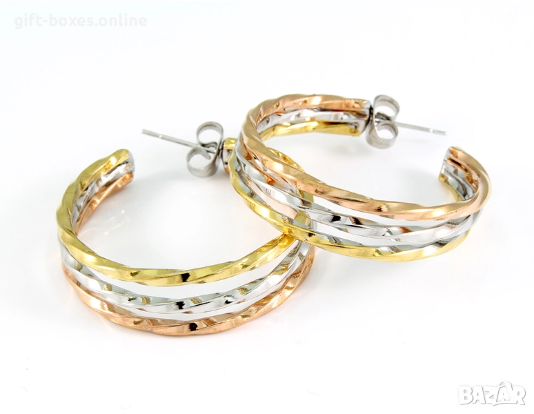 Стилни обеци изработени от полирана стомана в три цвята:SILVRGOLD,GOLD и ROSE GOLD.