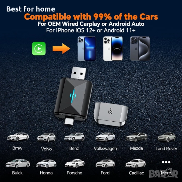 【𝐔𝐧𝐢𝐯𝐞𝐫𝐬𝐚𝐥 𝐂𝐨𝐦𝐩𝐚𝐭𝐢𝐛𝐢𝐥𝐢𝐭𝐲】Поддържа iPhone 8 или по-нови версии (iOS 11+) и телефони с Android 11+. Съвместим с над 98% от автомобилите с фабрично окабелени App1e CarPlay и Android Auto, произведени след 2016 г. — включително Ford Focus, Audi, Toyota, VW и други. (Не е съвместим с BMW, Benzin или Tesla.)