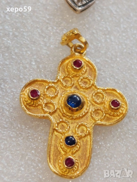 с орнаменти и инкрустирани рубини и аметисти.Злато 14к с двадесет и две каратово покритие.цена 850 лв. Сребърен кръст със седеф златни 14каратови апликации-цена 300 лева.