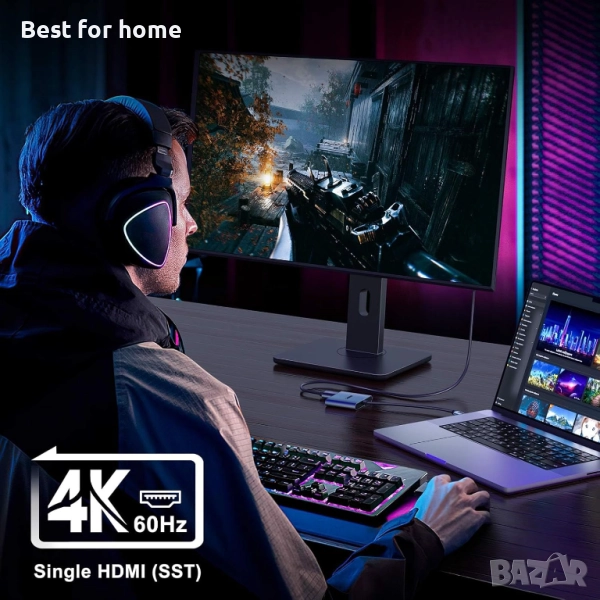 【4K 60Hz】Когато се използва един HDMI порт, резолюцията е до 4K@60Hz (3840X2160P@60Hz). Когато и двата HDMI порта се използват едновременно, максималната поддържана резолюция е ограничена до 4K@30Hz. Този USB C към HDMI адаптер е обратно съвместим с 2K/1080P резолюция при 60Hz. Забележка: Ако искате да получите 4k резолюция, моля, уверете се, че вашето устройство поддържа 4K и използва HDMI кабел 2.0 или по-добър.