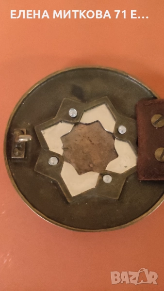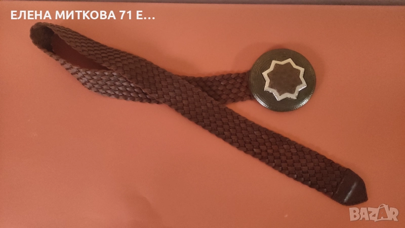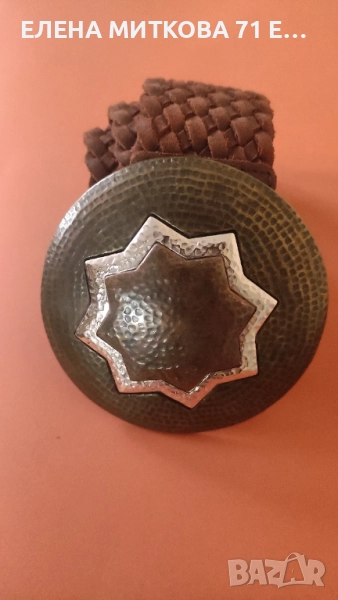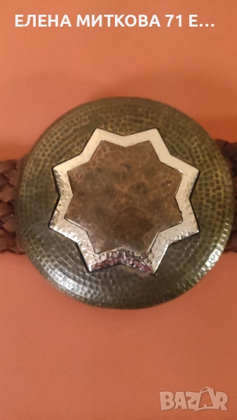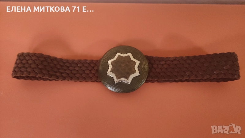1/Плетен велурен колан с кръгла тока ,изработена от месинг и мед и сребрист метал-особено подходящ за народна носия според мен-дължина с токата 96 см , диаметър на токата 10 см ,ширина 4.5 см