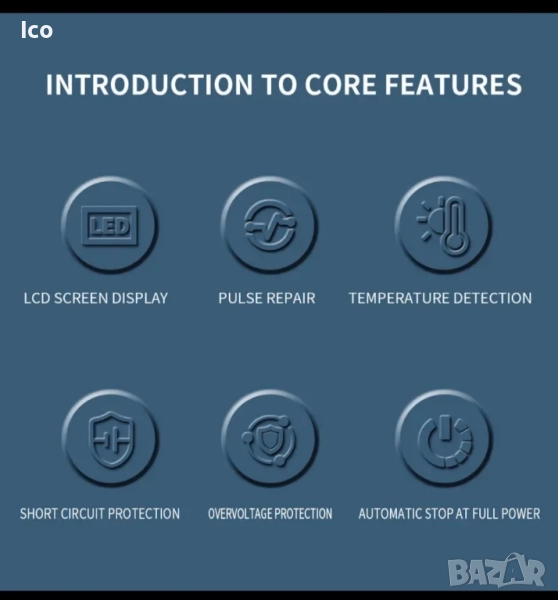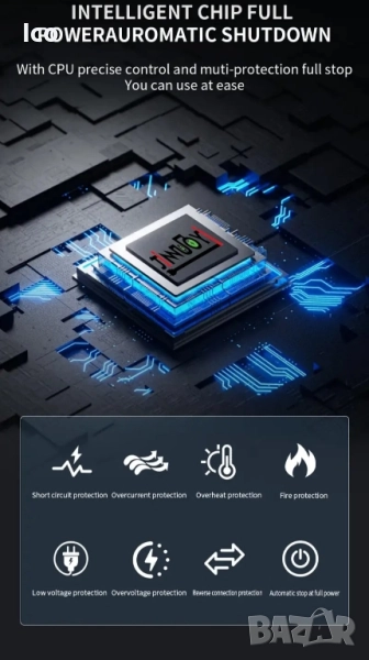 12V ИНТЕЛИГЕНТНО ИМПУЛСНО РЕМОНТНО ЗАРЯДНО УСТРОЙСТВОМоделNY-12-BВходно напрежениеDC 12-15.5 VИзходно напрежениеDC 12-15.5 VТекущDC 6-6 AПриложение12V 4Ah-120Ah батерия (литиевата е деактивирана) Илюстрация на екрана Екранът показва следната информация: Напрежение: Показва текущото напрежение на батерията. Ток: Показва тока на зареждане. Температура: Показва температурата на околната среда. Състояние на батерията: Показва нивото на зареждане на батерията. Индикатори: ПУЛС: Показва, че режимът за възстановяване на пулса е активен. ЗАРЕЖДАНЕ: Показва, че батерията се зарежда в момента. ГРЕШКА: Показва повреда или проблем. Примерен дисплей: 13.8V 4.5A 25°C [икона на батерия] [икона за зареждане] Избор на режим Зарядното устройство предлага няколко режима на работа: АВТОМАТИЧЕН РЕЖИМ: Подходящ за всички видове акумулаторни 12V оловно-киселинни батерии (12V 4Ah-120Ah). AGM/GEL РЕЖИМ: Специално проектиран за AGM и GEL батерии. МОТО РЕЖИМ: Подходящ за мотоциклети и други 12V батерии (12V 4Ah-120Ah). ИМПУЛСЕН РЕЖИМ: Използва се за ремонт на батерии. Този режим може да помогне за ремонт на батерии, които не са били използвани дълго време или са повредени.